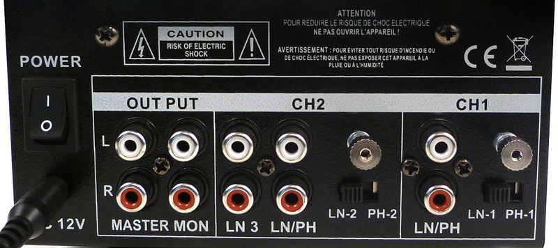 2 x Line / Phono Inputs in Chinch, 1 Mikrofoneing. USB-Eingang + USB Player mit Digitaldisplay, Bluetooth Eingang, Gain, 3-fach Klangregelung,Crossfader, Ausgang Master + Monitor Chinch.